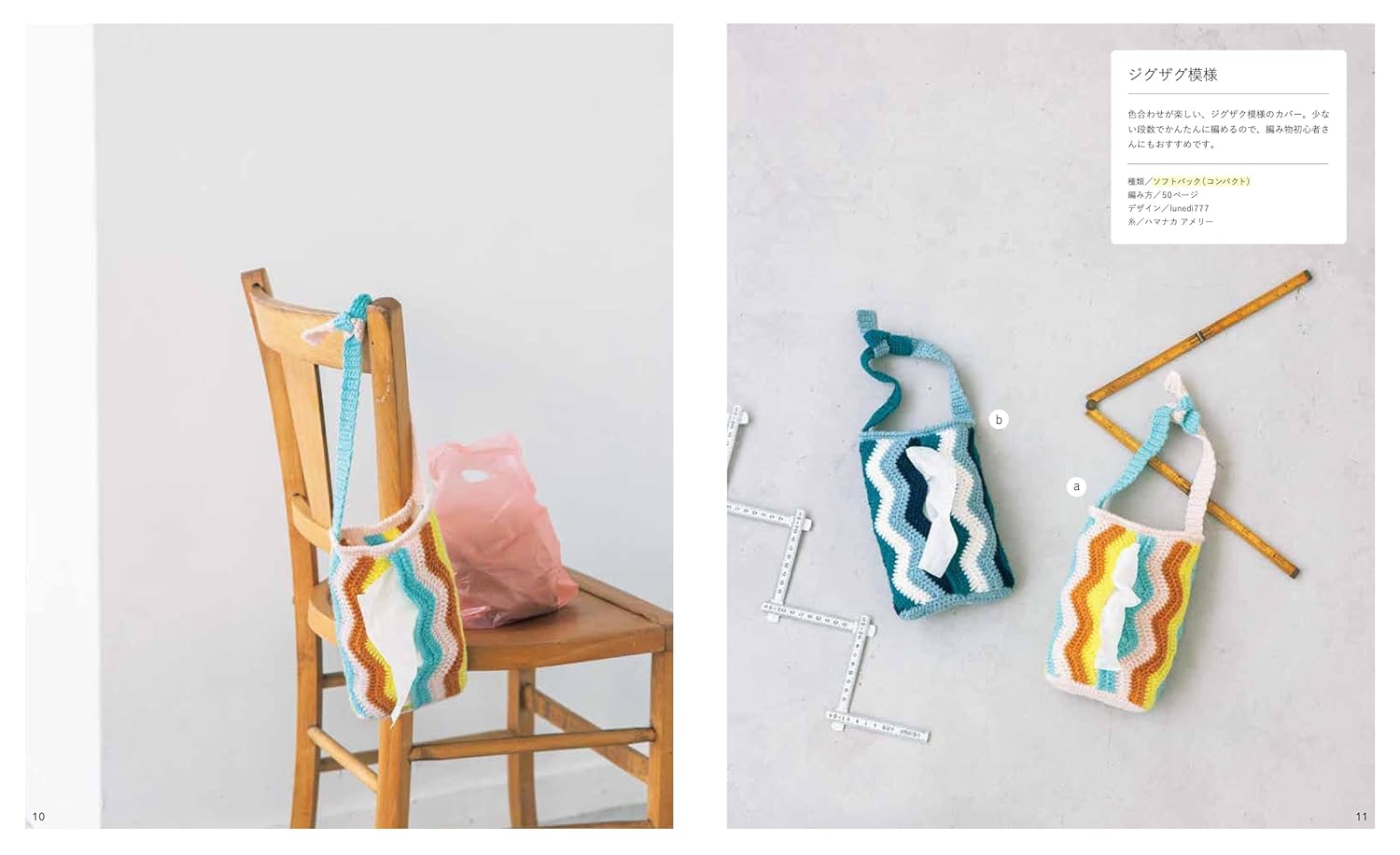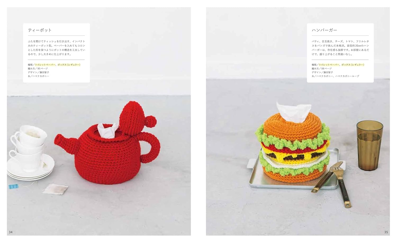 The book introduces covers for four types of tissues: standard box tissues, soft-pack tissues (plastic, no box), half-size tissues, and even toilet paper rolls.