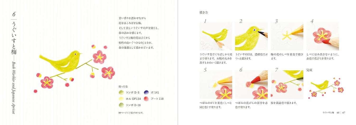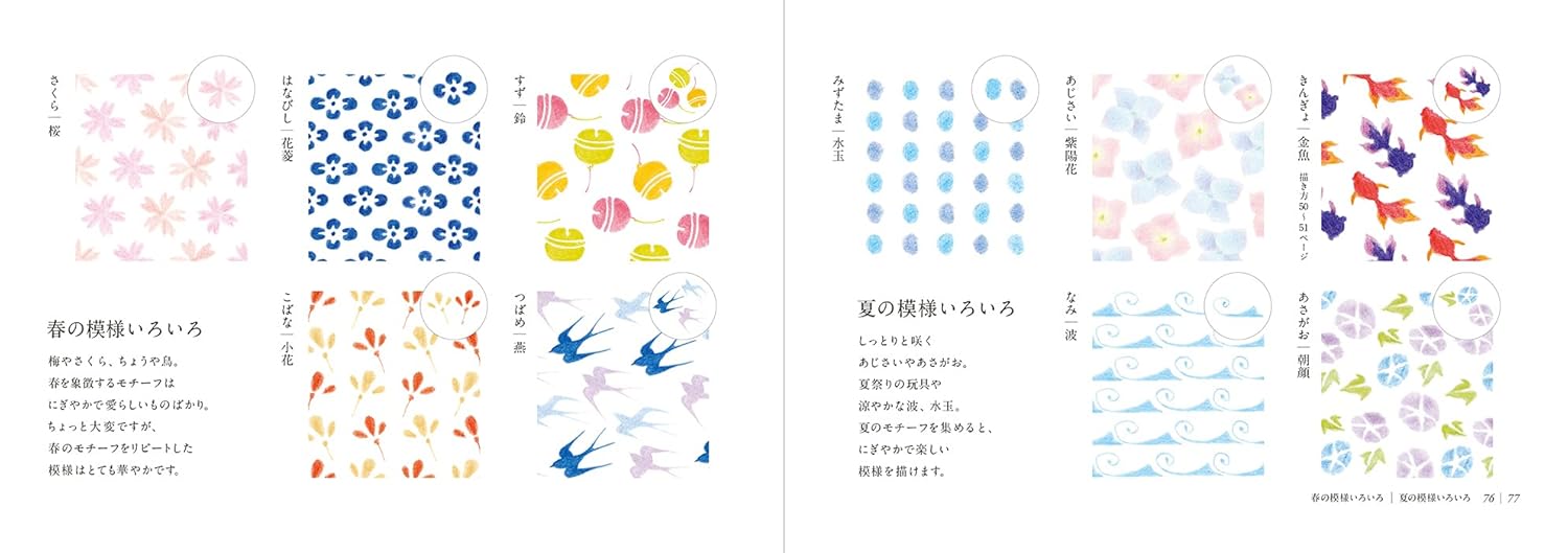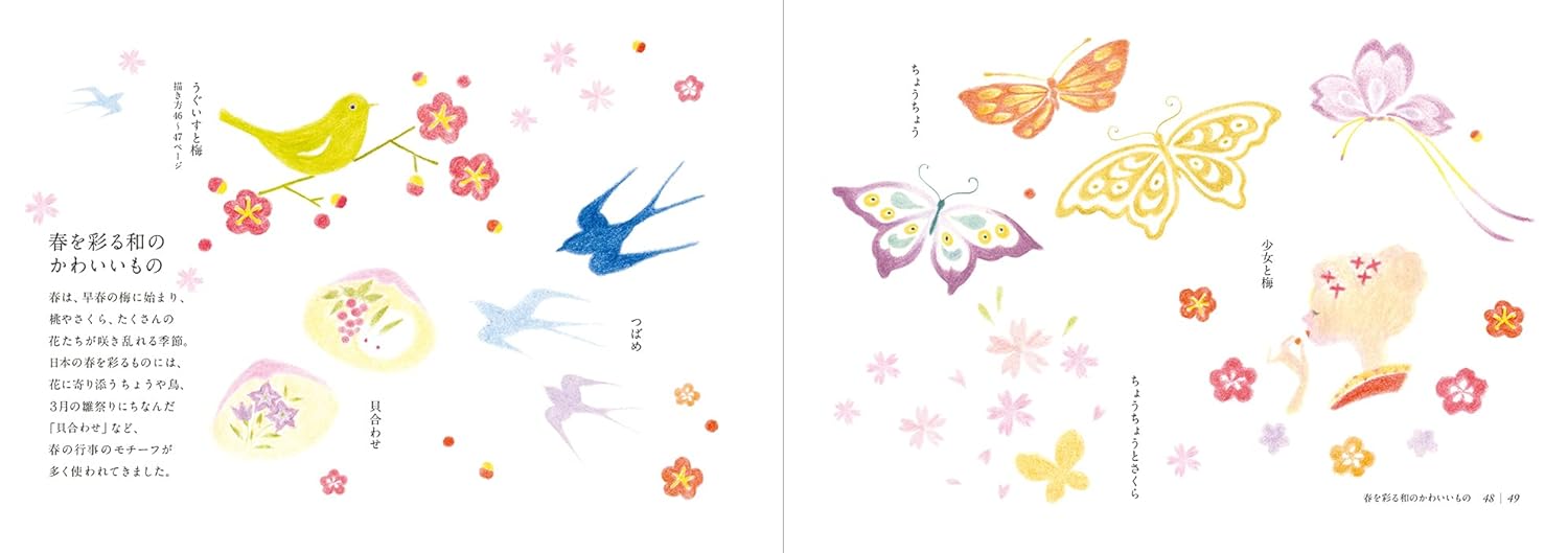 The book introduces how to draw beautiful illustrations of traditional Japanese motifs and designs with colored pencils.