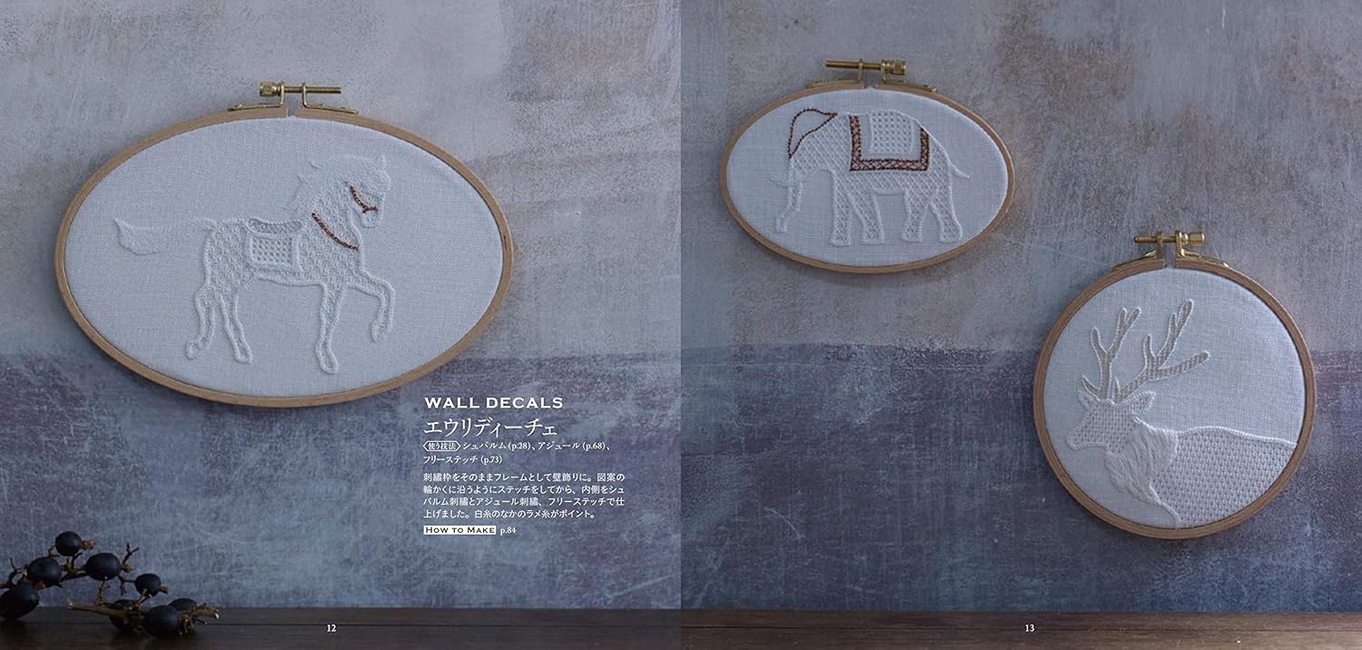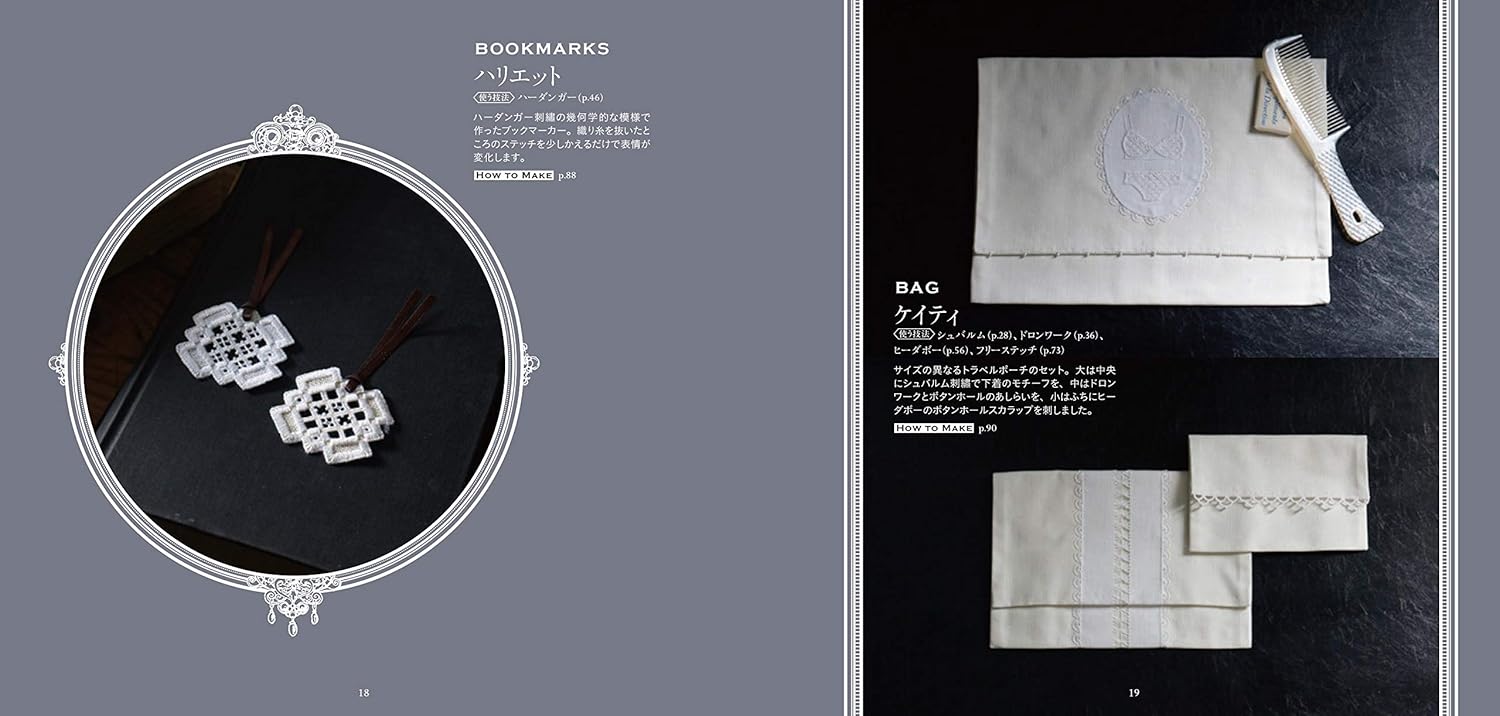 Straw Hat, Garland, Earrings, Brooch, Coogee, Wall Clock, Parasol, Wall Decoration, Eye Pillow, Shoes Keeper, Initial Handkerchief, Bookmarks, Bags, Cardigan, Sachet, Tools Case, Pin Cushion, and Shirt.