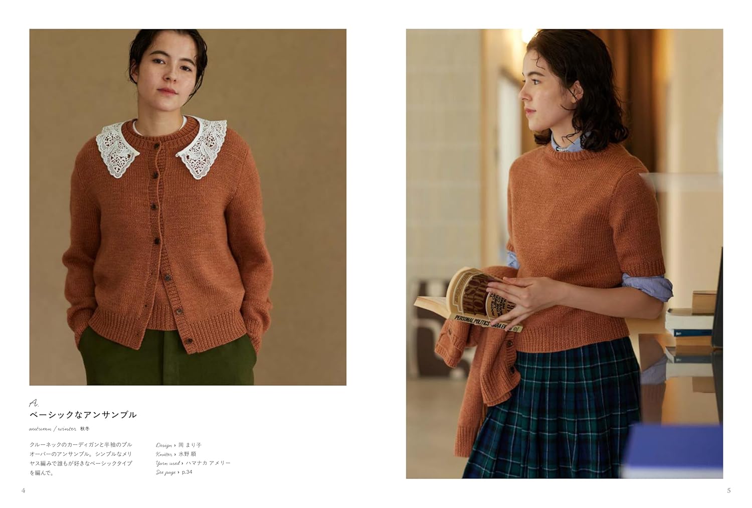 The book also offers coordinated three-piece sets including skirts, making it a delightful volume for anyone who enjoys styling knitwear.
