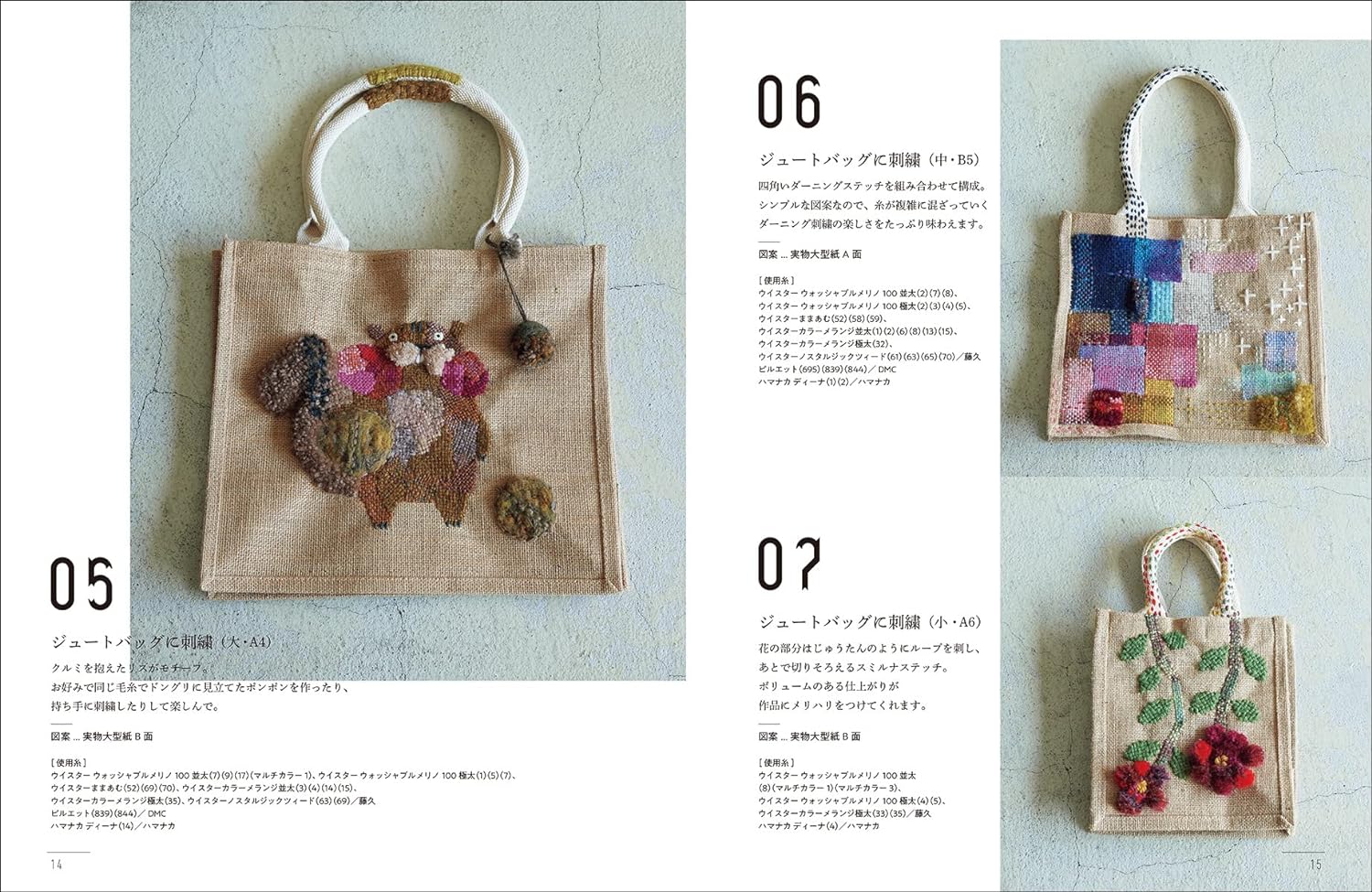 The yarns used are mainly wool yarns. Yarns left over from knitting are a great help.