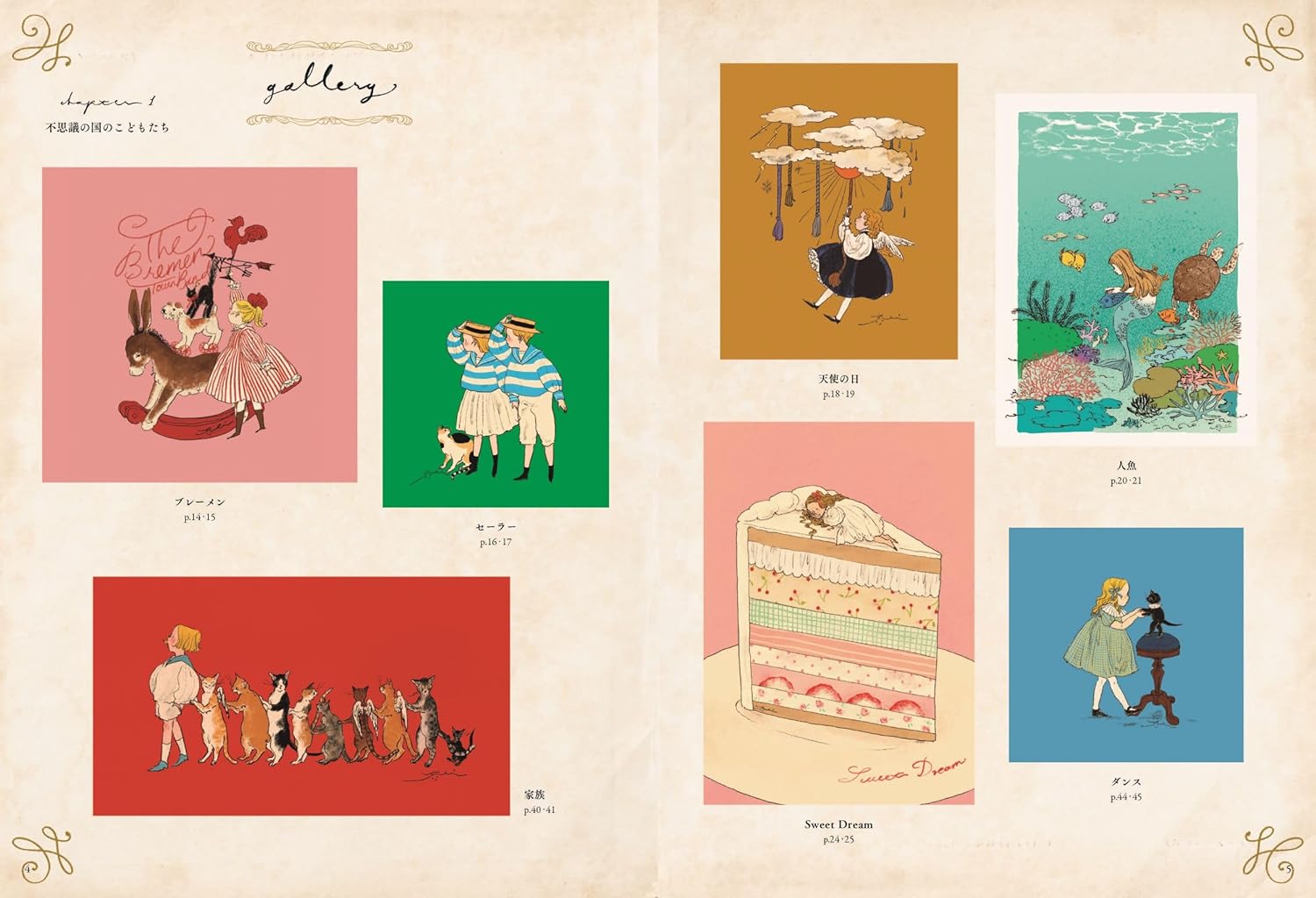 The unique illustrations of children, animals, cats with various expressions and seasons are introduced.