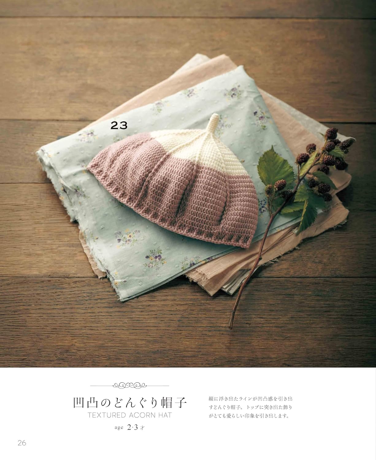 It features a wide variety of adorable and stylish designs, including a textured stitch beret, a frilly brim hat, a hood-style hat made with connected motifs, and fun animal hats such as a rabbit hat and a lion hat, which are especially popular with children. The book also includes a charming acorn-style hat with textured stitches.